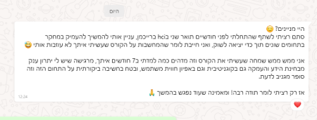 לפני הכל פגשתי אדם אנושי, שאומר את האמת. שפשפתי את האוזניים לוודא שאכן שומעת נכון ... :) זה לא מובן מאליו. מעבר לכך תכני הקורס היו ברמת עומק, קושי ואינטנסיביות...